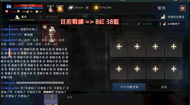 這邊討論的紫變 是沒甚麼機體的紙變 其實天堂出到現在 很多人都轉分身流了 只是分身有幾隻而已 漸漸的 也開始收割分身帶來的效益 很多實況主也都開始拼合成紫變了 版上也有開始有人分享 合紫變一發入魂的歐氣 昨天實況主 tony也幫人代合紫變 一發入魂 似乎紫變已經開始慢慢開始越來越常見了 是不是也代表 非大課機體的紙變 也會開 引用來源: 遊戲角落 點我前往 : 《天堂m》狂砸百萬紫變土豪 他說:我不是工讀生 看天堂2m看韓國課長 5000萬韓元抽紅變、紫娃娃巴溫 他能抽到嗎?(更新) 抽紅變身卡 抽紫娃娃 巴溫影片 不錯的抽卡分享 讓各位了解一下天堂2m的紅變機率大概是多少? 1.身上有多出來的同種類變身卡才能夠拿去合成 2.合1次需要4張 重複的4張 = 1次合成機會,合成機率我不知道,這位玩家是第四次合成時出. 加入 taptap 天堂 m社区论坛,这里有完整细致的天堂 m游戏攻略,精彩繁多的天堂 m玩家视频,让你在最火爆的游戏社区找到志同道合的游戏伙伴。